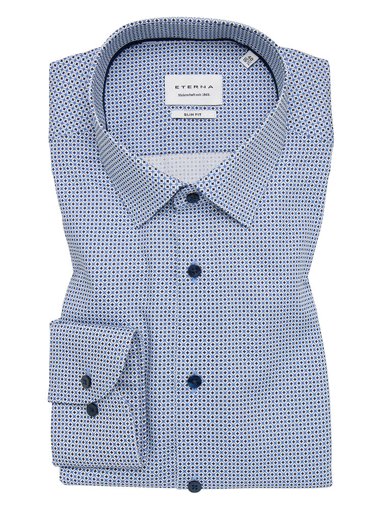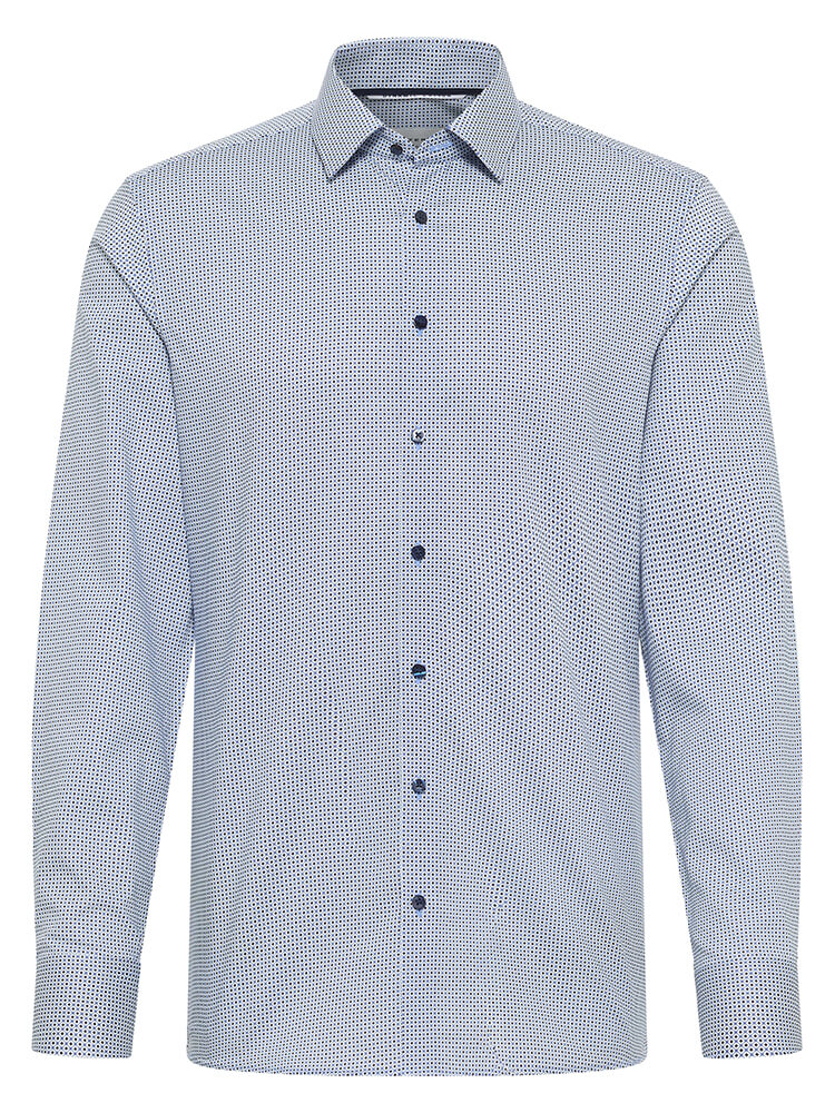 La camicia da ufficio elegante della collezione ETERNA Slim Fit rappresenta l'uomo snello e attento alla moda di oggi. Una vestibilità slim combinata con dettagli alla moda promettono un alto livello di comfort e fanno di questa camicia un artista della combinazione. La camicia fantasia de uomo del colore azzurro da uomo non dovrebbe mancare nel guardaroba di nessun uomo e può essere indossata con il collo elegante e classico Kent per qualsiasi occasione e nella vita di tutti i giorni. Questa camicia da uomo ETERNA Slim Fit si presenta al meglio con una cravatta stretta e un piccolo nodo di cravatta.